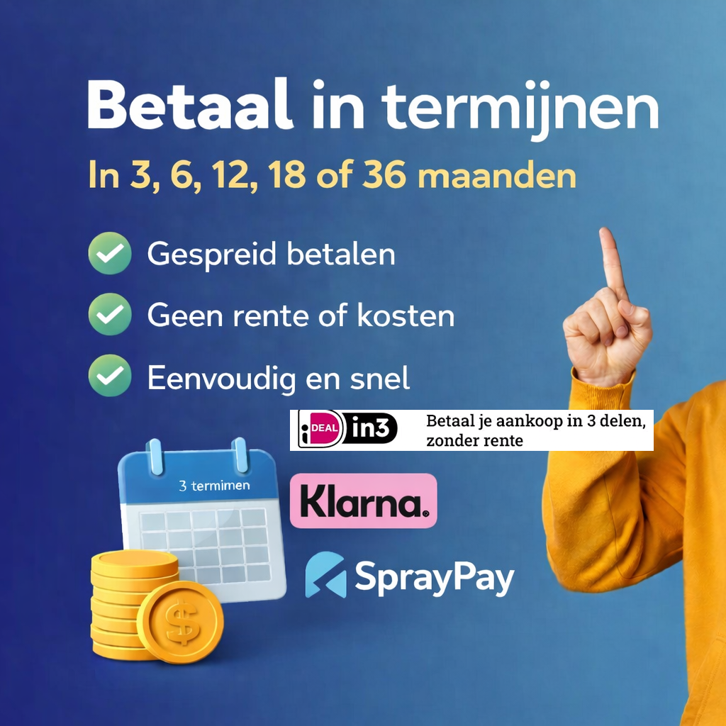 Payin3, Klarna, Billie, Spraypay dit kan is mogelijk in termijnen van 3 tot 36 maanden.
